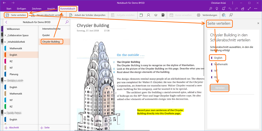 Auch für eine Audioaufnahme im (Fremd-)Sprachenunterricht eignen sich Smartphones hervorragend. In dem unseren Lehrpersonen gezeigten Beispiel habe ich eine Aufgabenseite in OneNote erstellt und diese allen Schülerinnen und Schülern in ihren Abschnitt verteilt.
