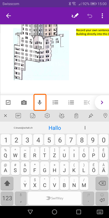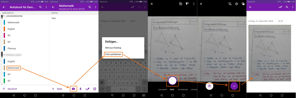 Die Schülerinnen und Schüler meiner kleinen Demoklasse hatten alle die OneNote App auf ihrem Smartphone installiert und das gemeinsame Kursnotizbuch geöffnet. Um nun ein Foto aufzunehmen, kann man einfach die gewünschte Seite öffnen und dort ein Foto erstellen. Nach wenigen Sekunden ist das Bild auf die OneNote App der Lehrperson synchronisiert und kann dort weiter besprochen und allenfalls auch (z.B. mit einem Smartboard) weiter bearbeitet werden.