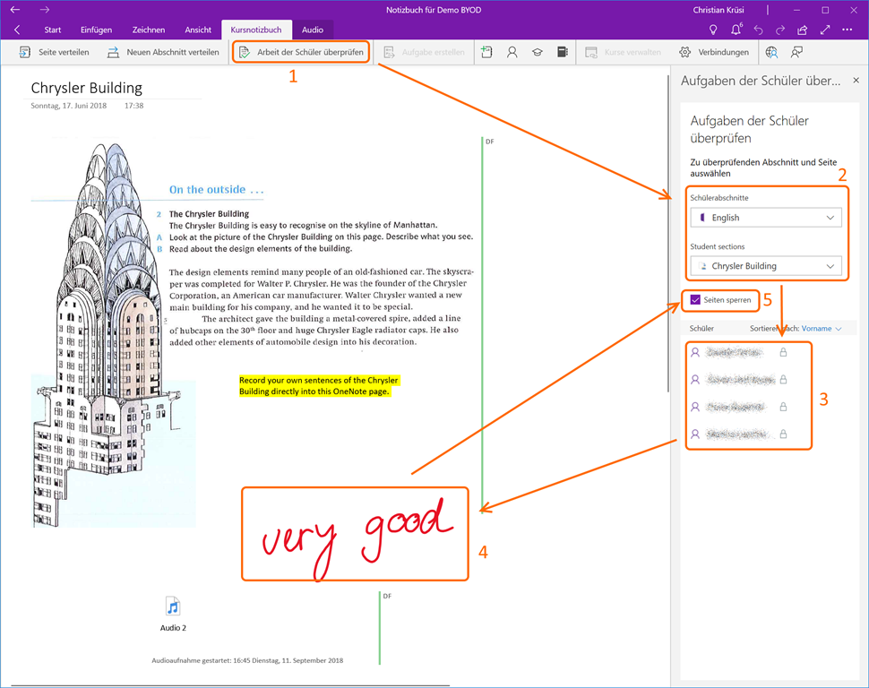 Die Lehrperson kann nun alle Aufnahmen überprüfen, indem sie “Arbeit der Schüler überprüfen” (1) und dann die entsprechende Seite (2) auswählt. Sie kann einfach zwischen den einzelnen Schülerinnen und Schülern wechseln (3) und entweder schriftlich (oder auch als Audioaufnahme) eine Rückmeldung geben (4). Wenn gewünscht, kann sie danach die Seiten sperren (5).