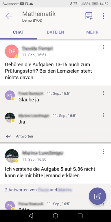Ich habe unseren Input gerade auch noch dazu benutzt, unseren Lehrpersonen aufzuzeigen, wie man Teams für einen Chat benutzen kann. Unser Schulrat hat beschlossen, dass Lehrpersonen WhatsApp nach der Anhebung des Mindestalters nicht mehr für einen Klassenchat benutzen dürfen. Mit Teams steht eine gute Alternative bereit, die sich datenschutzkonform benutzen lässt.
