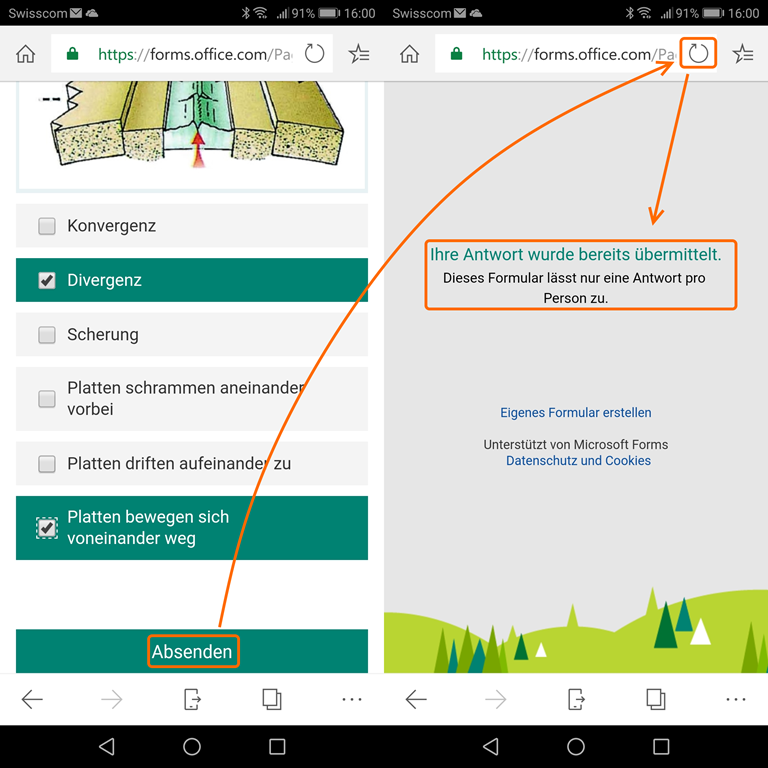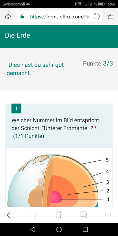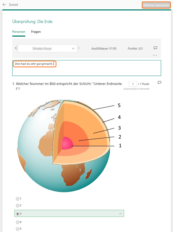 Nachdem die Lehrperson das gemacht hat, kann die Schülerin ihre Antworten und die erfasste Rückmeldung wieder anzeigen, aber nicht mehr ändern. Dies könnte man z.B. als Grundlage für eine Verbesserung nehmen.