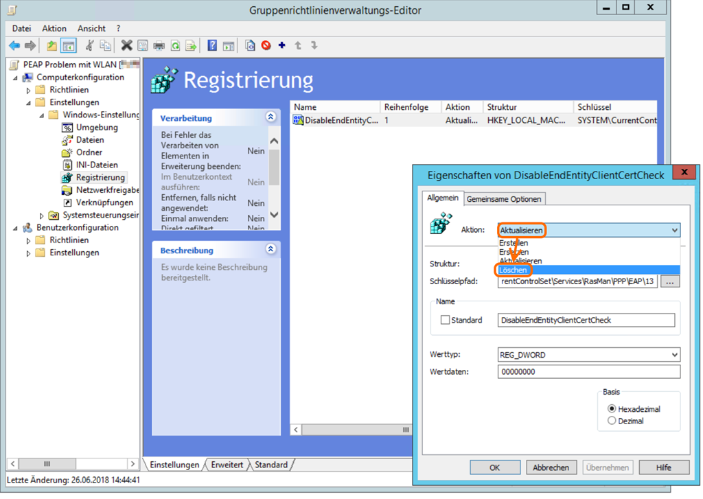 Beides ist natürlich gar nicht optimal. Wenn man nun den für den Workaround erstellten Registryeintrag HKLM\SYSTEM\CurrentControlSet\Services\RasMan\PPP\EAP\13\DisableEndEntityClientCertCheck wieder löscht, scheint das Problem behoben. Dazu ändert man in der Gruppenrichtlinie die Aktion von “Aktualisieren” auf “Löschen”.