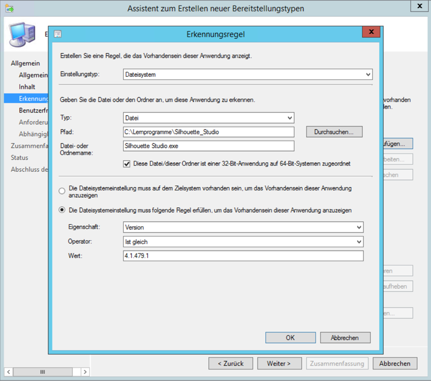 Bei der Erkennungsregel gibt man an, dass die Programmdatei in der gewünschten Version vorhanden sein muss.