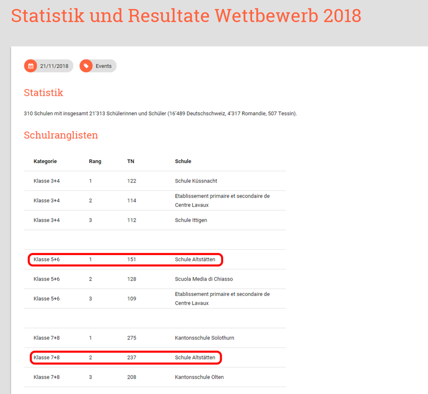 Auch dieses Jahr haben wir wieder am Informatikbiber teilgenommen. Neben den Leistungen von einzelnen Schüler/-innen werden auch die Schulen mit den meisten Teilnehmer/-innen ausgezeichnet. Hier haben wir es auch dieses Jahr wieder in einzelnen Kategorien unter die ersten 3 Schulen geschafft: