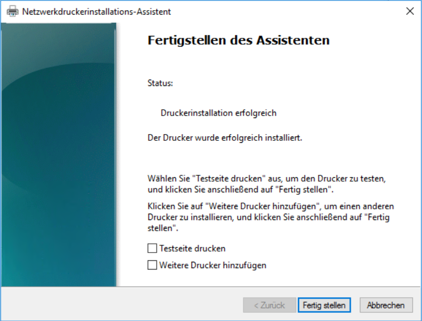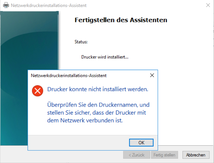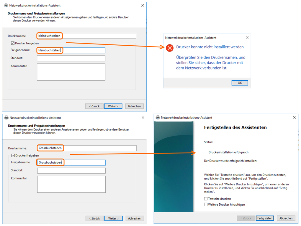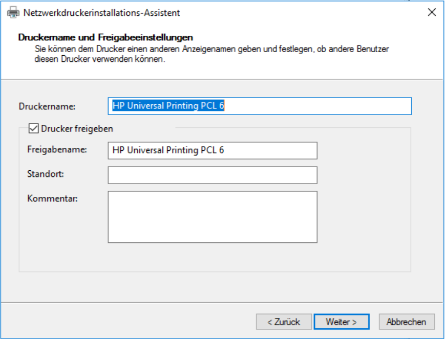 Bei meinen Tests wurde ich nachlässig und habe einmal weder den Druckernamen, noch den Standort angepasst.