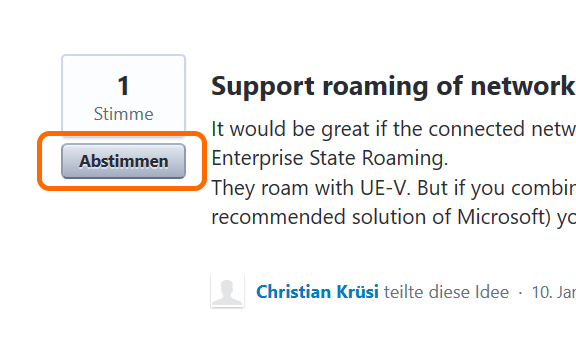 Wie in diesem Beitrag beschrieben, fehlt uns noch einiges bei der von Microsoft favorisierten Lösung für das Wandern der Benutzerprofildaten in einem Netzwerk. Man kann aber bei Microsoft Wünsche anbringen. Umso mehr Personen diese unterstützen, desto grösser ist die Chance, dass sie umgesetzt werden.