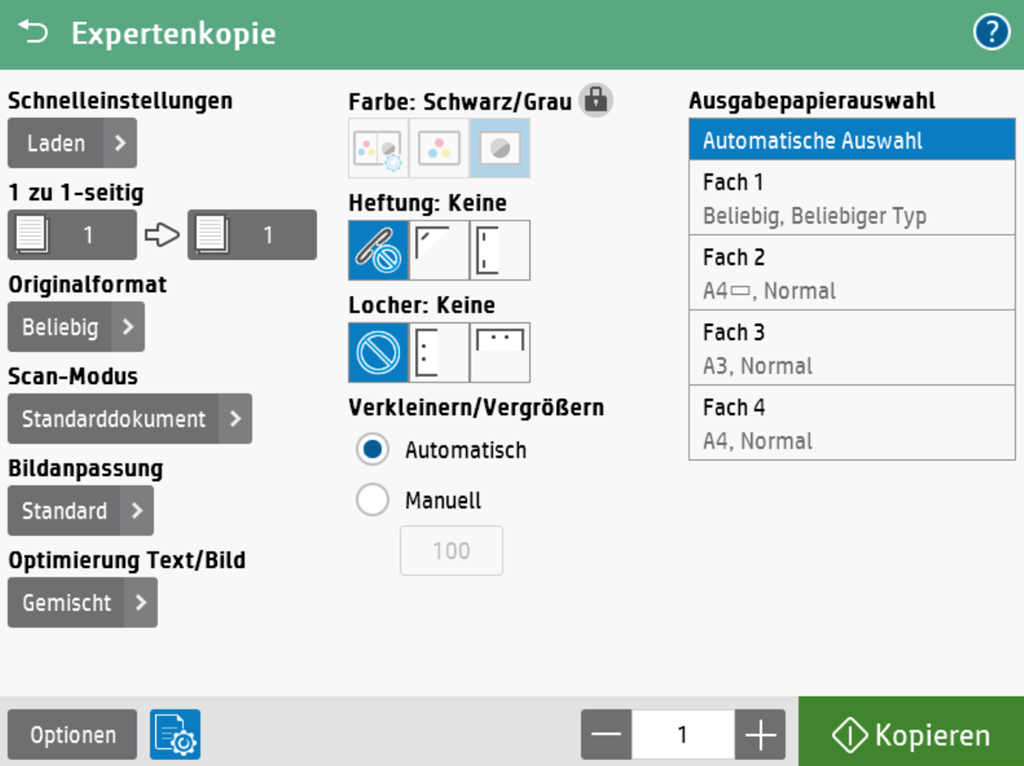 Nach einem Firmwareupdate lassen sich die Kopiereinstellungen unserer HP Kopierer in einer weiteren Ansicht anzeigen.