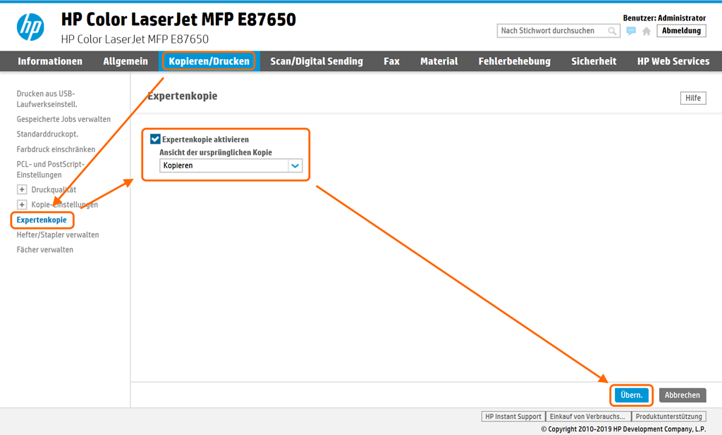 Um die Ansicht Expertenkopie zur Verfügung zu stellen, muss man sich an der Weboberfläche des Kopierers anmelden. Dort wählt man “Kopieren/Drucken” und dann “Expertenkopie”. Hier muss man das Häklein bei “Expertenkopie” setzen und kann bei Ansicht der ursprünglichen Kopie auswählen ob man die alte Einstellung (Kopieren) oder die neue Einstellung (Expertenkopie) als Standard fürs Kopieren möchte.
