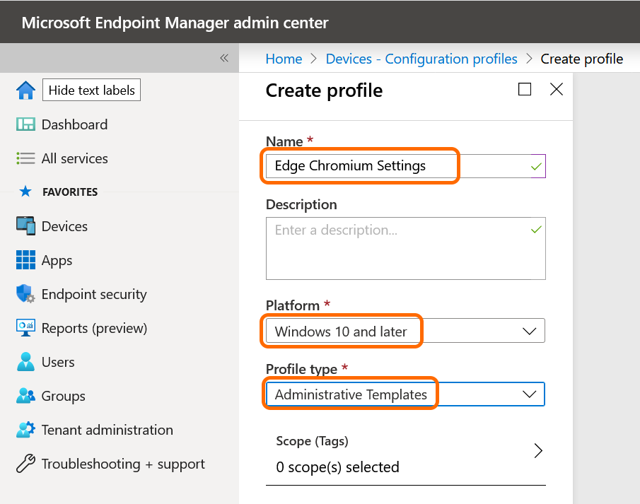 Im nächsten Fenster muss man einen Namen für das Profil vergeben, die “Platform” wählen und als “Profile type” “Administrative Templates” auswählen.