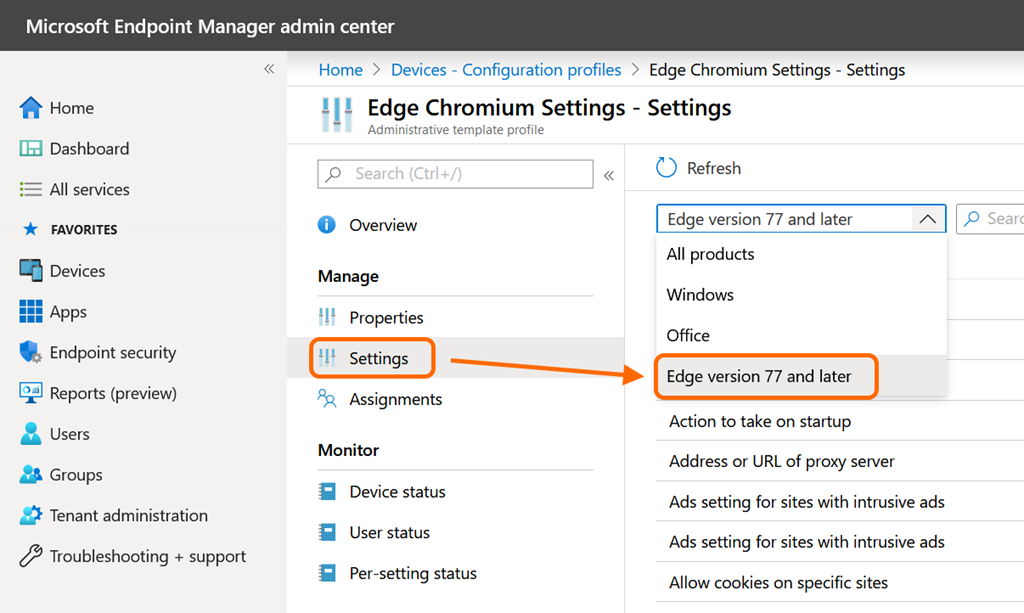 Wenn man nun bei “Settings” “Edge version 77 and later” auswählt, erhält man wie bei den Gruppenrichtlinien eine Fülle von Konfigurationsmöglichkeiten. Es gibt Einstellungen für “User” oder für “Device”. Die gemachten Einstellungen müssen dann auch über “Assignments” einer entsprechenden Gruppe (mit Benutzern oder Geräten) zugewiesen werden.
