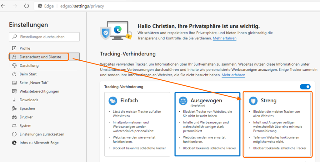 Ich möchte so wenig wie möglich getrackt werden. Daher wähle ich bei “Datenschutz und Dienste” die restriktivste Einstellung “Streng”.