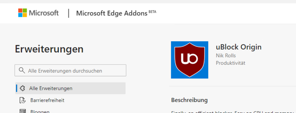 Wer noch weiter gehen möchte, kann wie ich über die 3 Punkte rechts oben und dann “Erweiterungen” die Erweiterung uBlock Origin, die ich schon mit dem alten Edge genutzt habe, installieren.