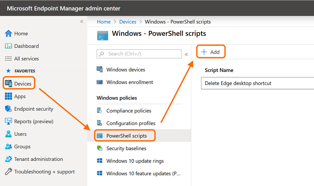 Im Microsoft Endpoint Manager admin center kann man nun über “Devices” –> “Windows” –> “PowerShell scripts” –> “+ Add” das Skript hochladen und an eine Gerätegruppe mit allen Geräten verteilen.
