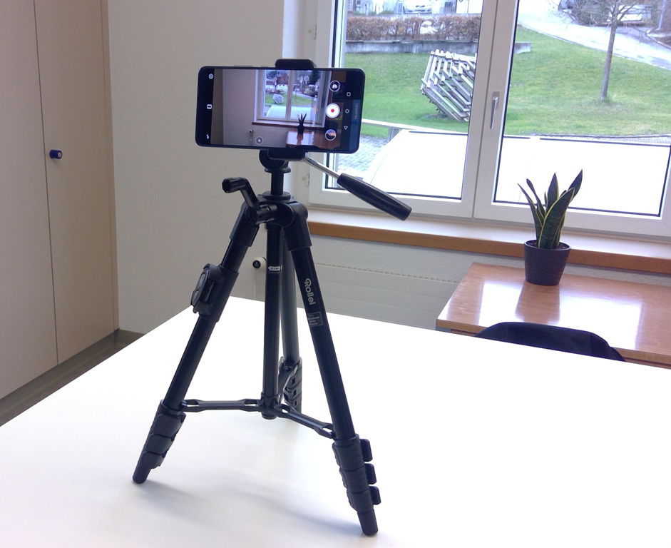 Oder man setzt ein Stativ ein. Ich habe mir testweise ein Stativ von Rollei für CHF 32.90 bestellt (digitec oder microspot). Dieses wirkt für den Preis erstaunlich stabil und scheint mir für eine Aufnahme mit dem Smartphone gut geeignet zu sein. Es ist sogar ein Bluetooth Sender zum Auslösen dabei.