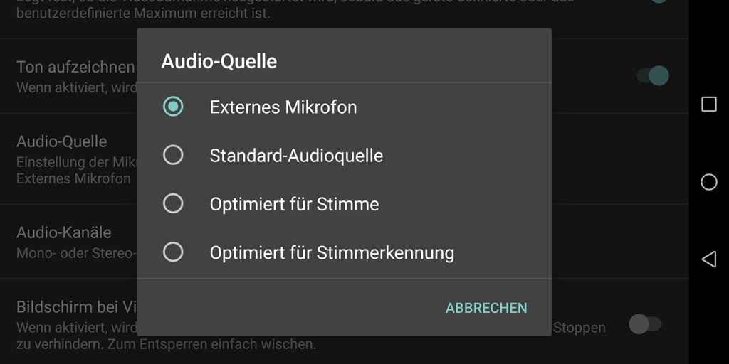 Der ganze Aufwand nützt natürlich nichts, wenn in der Aufnahme-App nicht auf das externe Mikrofon zugegriffen wird. Bei meinem Test mit der Standard App auf meinem Smartphone wurden die angehängten Mikrofone einwandfrei erkannt. Gemäss Internet muss das aber nicht bei jedem Smartphone so sein. Ich habe probehalber mal die App “Open Camera” für Android getestet. Dort kann man explizit auswählen, mit welchem Mikrofon man aufnehmen möchte.