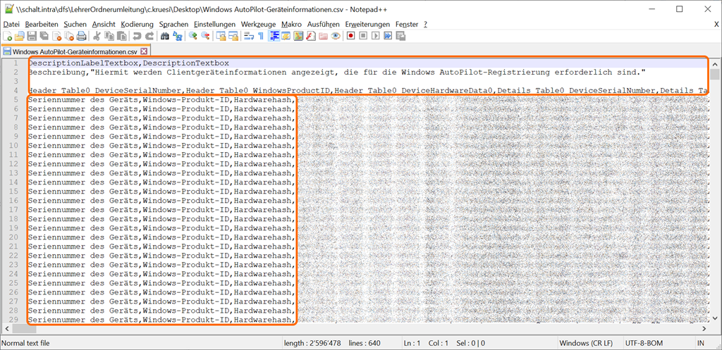 Der Bericht muss aber noch angepasst werden. Die ersten 4 Zeilen kann man löschen und durch “Device Serial Number,Windows Product ID,Hardware Hash” ersetzen. Auch die Beschreibungen am Anfang jeder Zeile müssen gelöscht werden.