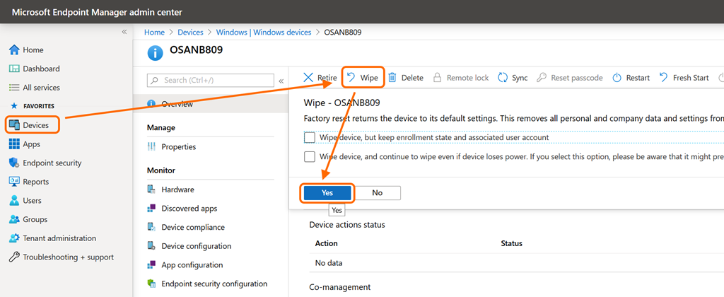 Um nun ein Gerät ausserhalb unseres Netzwerks als nur “Azure AD joined”, also ohne Verbindung mit dem internen AD, neu aufzusetzen, muss man das Gerät vollständig löschen. Man wählt also Wipe und setzt das Häklein bei “Wipe device, but keep enrollment state and associated user account” NICHT.