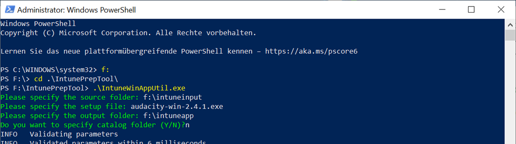 Danach öffnet man PowerShell als Administrator und startet das Content Prep Tool im entsprechenden Ordner. Hier muss man dann der Reihe nach den “source folder”, das “setup file” und den “output folder” angeben. Die Frage nach dem “catalog folder” kann man mit N beantworten.