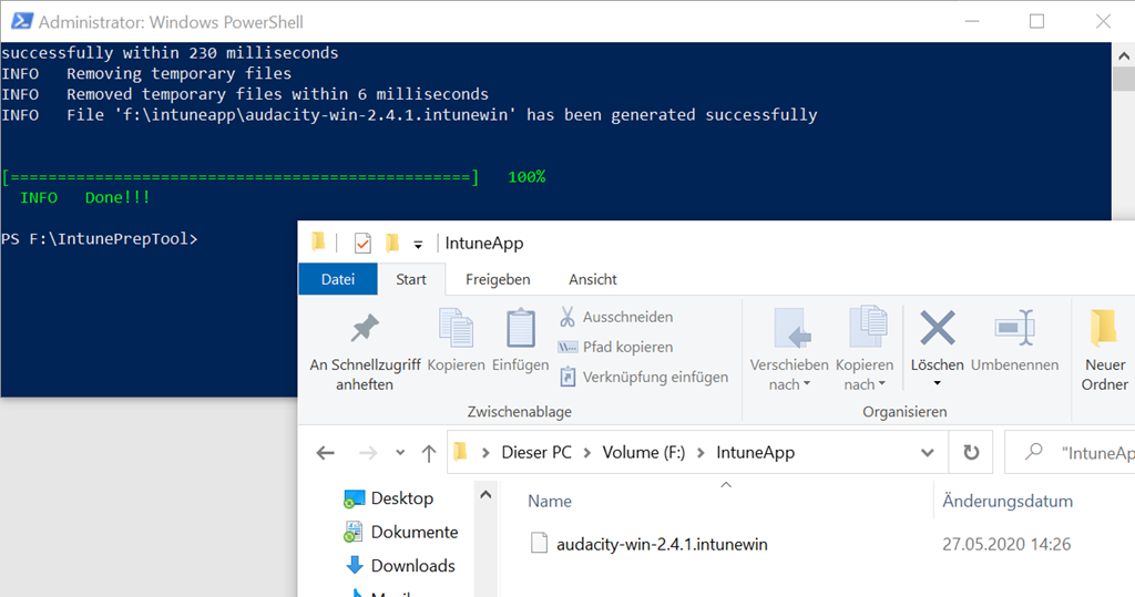Unten im Fenster läuft ein grüner “Balken” bis 100%. Danach findet man im “output folder” die entsprechende .intunewin Datei, die man nun über Intune verteilen kann.