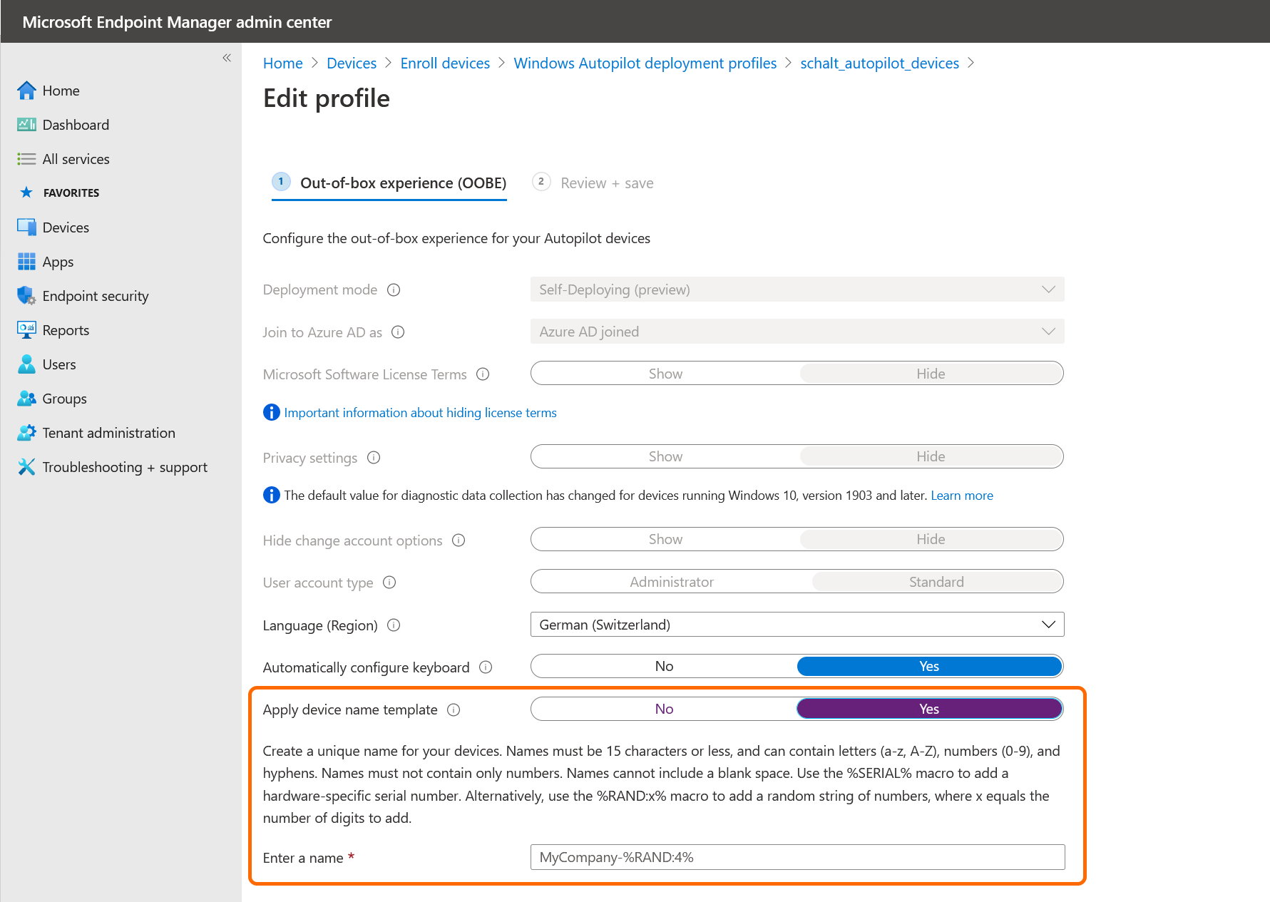 Mit einem „Autopilot Deployment Profile“ kann man den Namen etwas genauer steuern, indem man ein „device name template“ verfasst. So kann man den Namen hochzählen lassen (z.B. Surface0001,…) oder die Seriennummer im Computernamen verwenden.