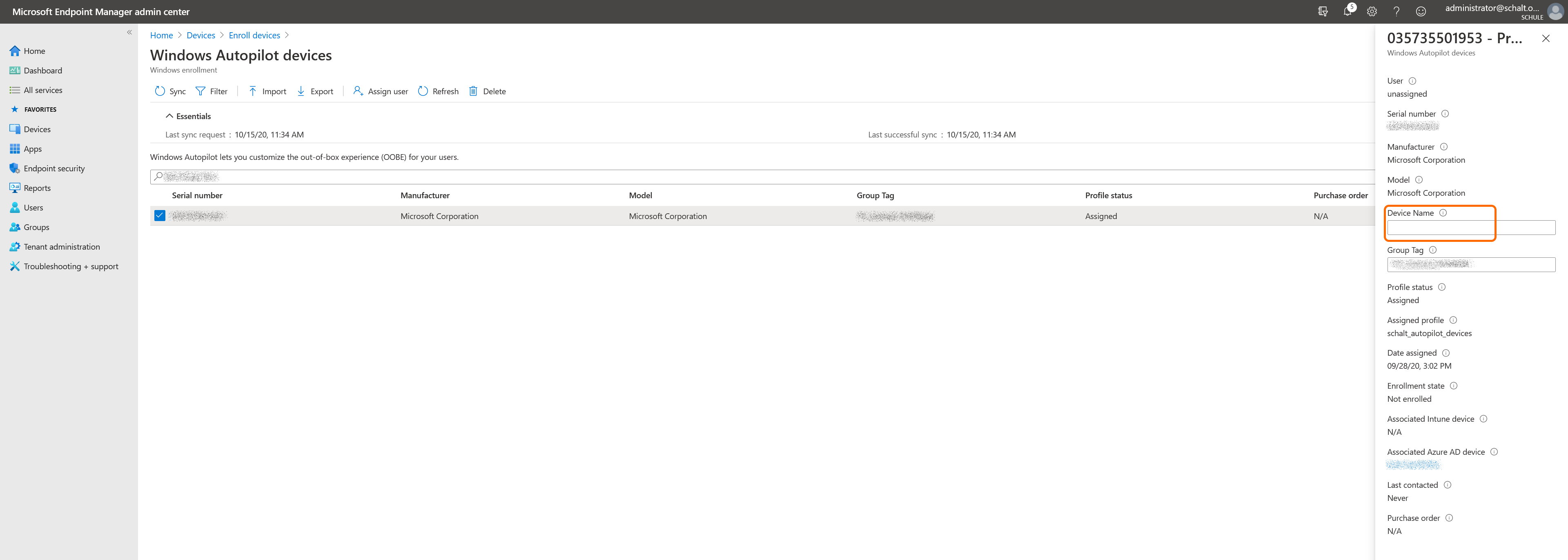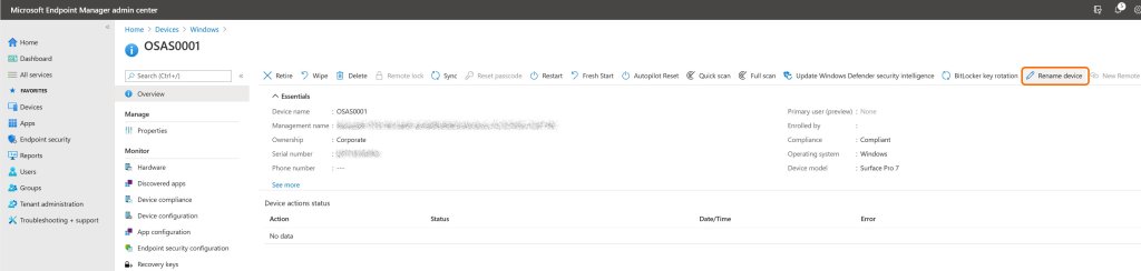 Man könnte den Gerätenamen in Intune jederzeit ändern, indem man das Gerät auswählt und „Rename Device“ wählt.
