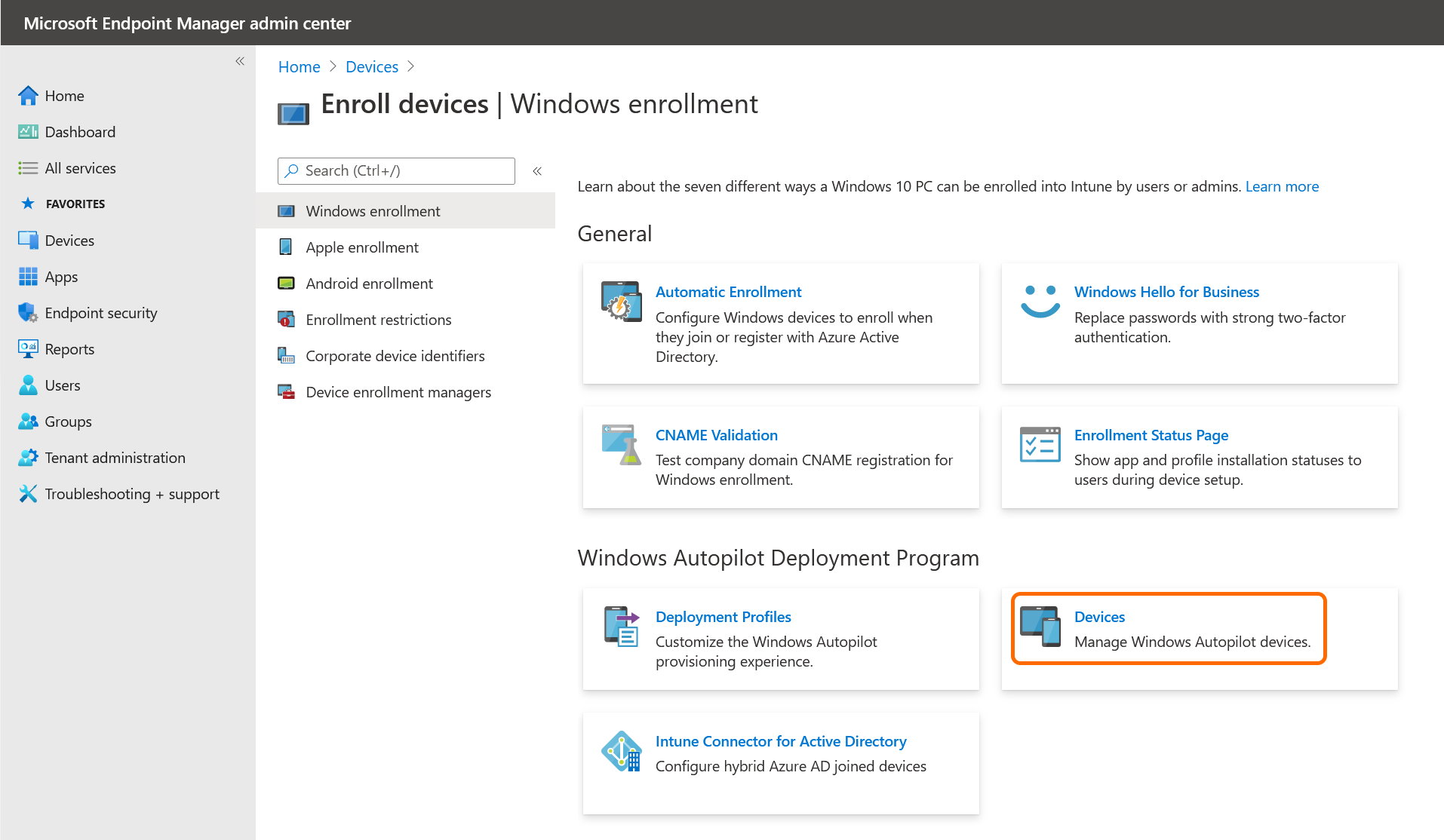 Es gibt aber auch die Möglichkeit, den Gerätenamen schon vor der Erstkonfiguration vorzugeben. Dazu wählt man „Devices“ -> „Enroll Devices“ -> „Devices – Manage Windows Autopilot devices“