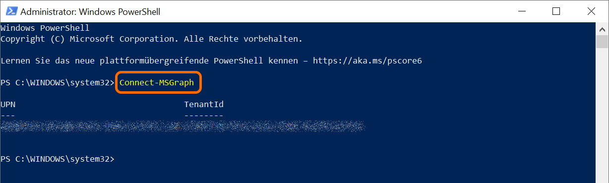 Nun muss man sich am Microsoft Graph mit einem Konto mit entsprechenden Rechten anmelden.