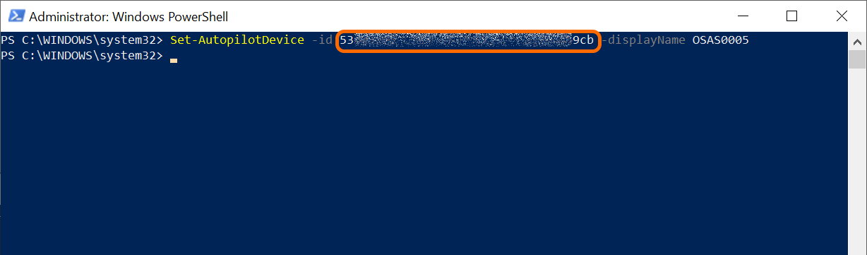 Set-AutopilotDevice -id 53xxxxx-xxx-xxxx-xxxx-xxxxxxxx9cb -displayName OSAS0005