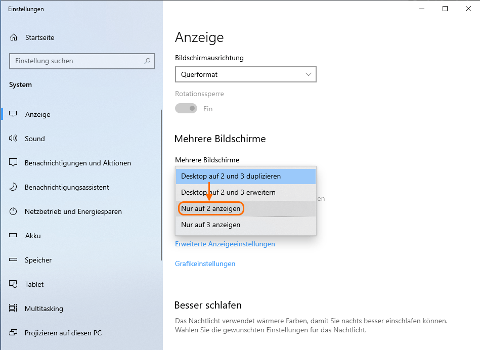 4. Von „Desktop auf 2 und 3 duplizieren“ auf „Nur auf 2 anzeigen“ wechseln.