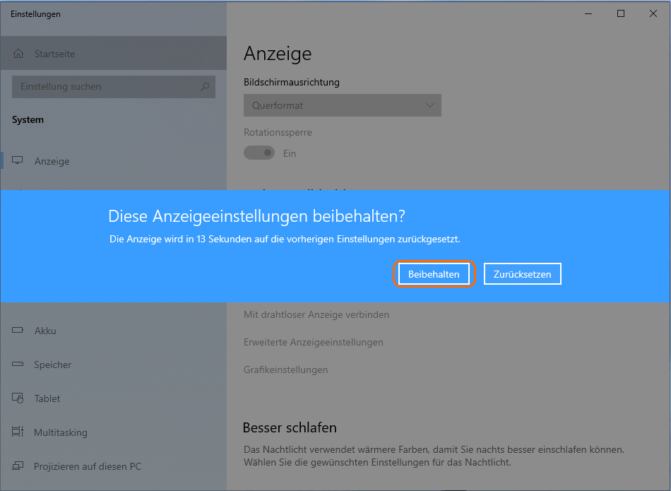 5. Die Frage „Diese Anzeigeeinstellungen beibehalten?“ mit „Beibehalten“ beantworten.