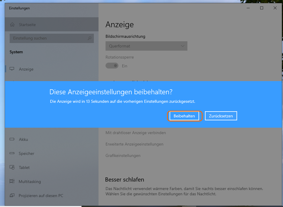 5. Die Frage „Diese Anzeigeeinstellungen beibehalten?“ mit „Beibehalten“ beantworten.