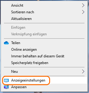 - Rechtsklick auf eine freie Stelle auf dem Desktop -> „Anzeigeeinstellungen“ auswählen.