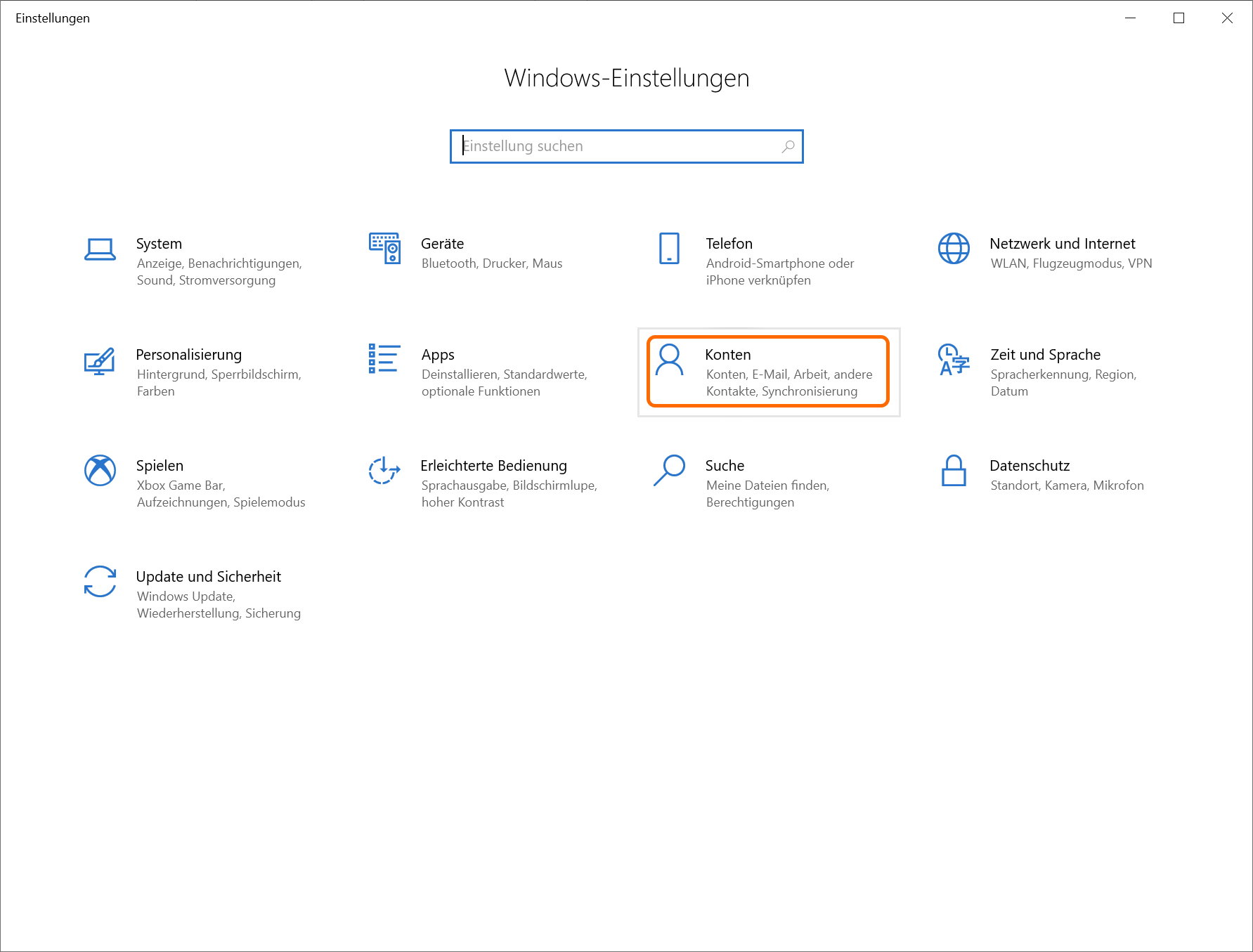 Der zweite Weg geht über die Windows Einstellungen. Hier wechselt man auf Konten.