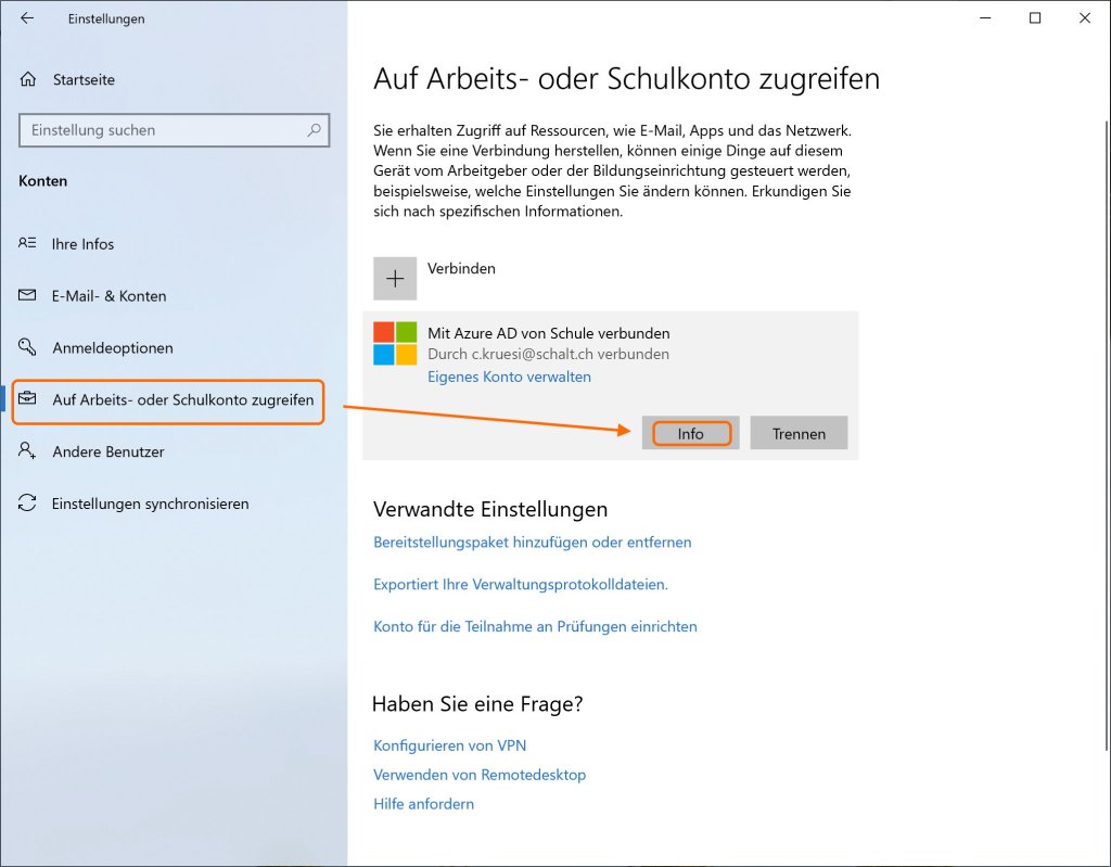 Links aussen wählt man nun „Auf Arbeits- oder Schulkonto zugreifen“ und dann die entsprechende Einstellung und dort auf „Info“.