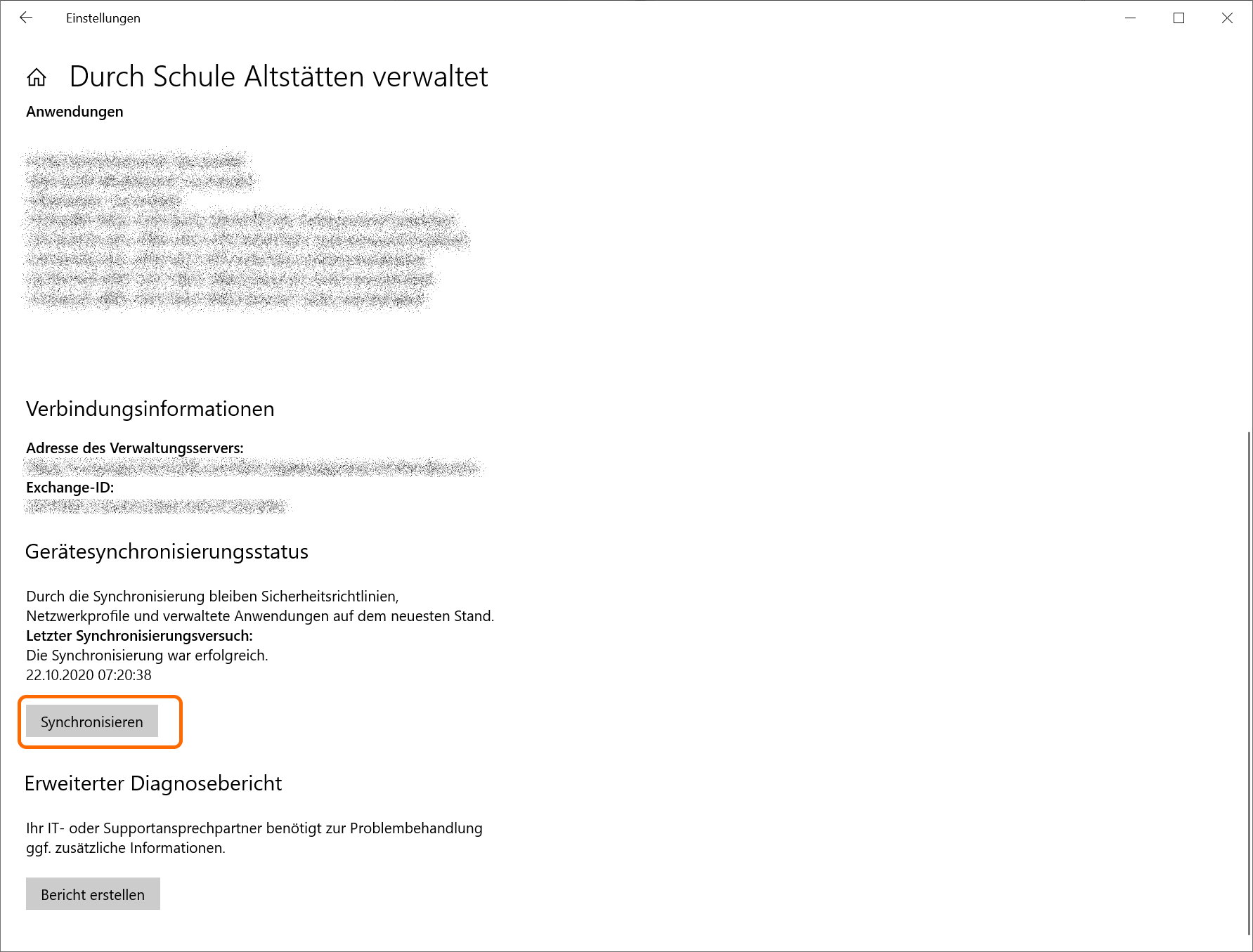 eine Synchronisation kann man auch sehr gut aus der Unternehmensportal App heraus auslösen. Diese App habe ich standardmäßig auf allen Geräten installiert. Dort kann man auch andere Apps sehr komfortabel zur Verfügung stellen.