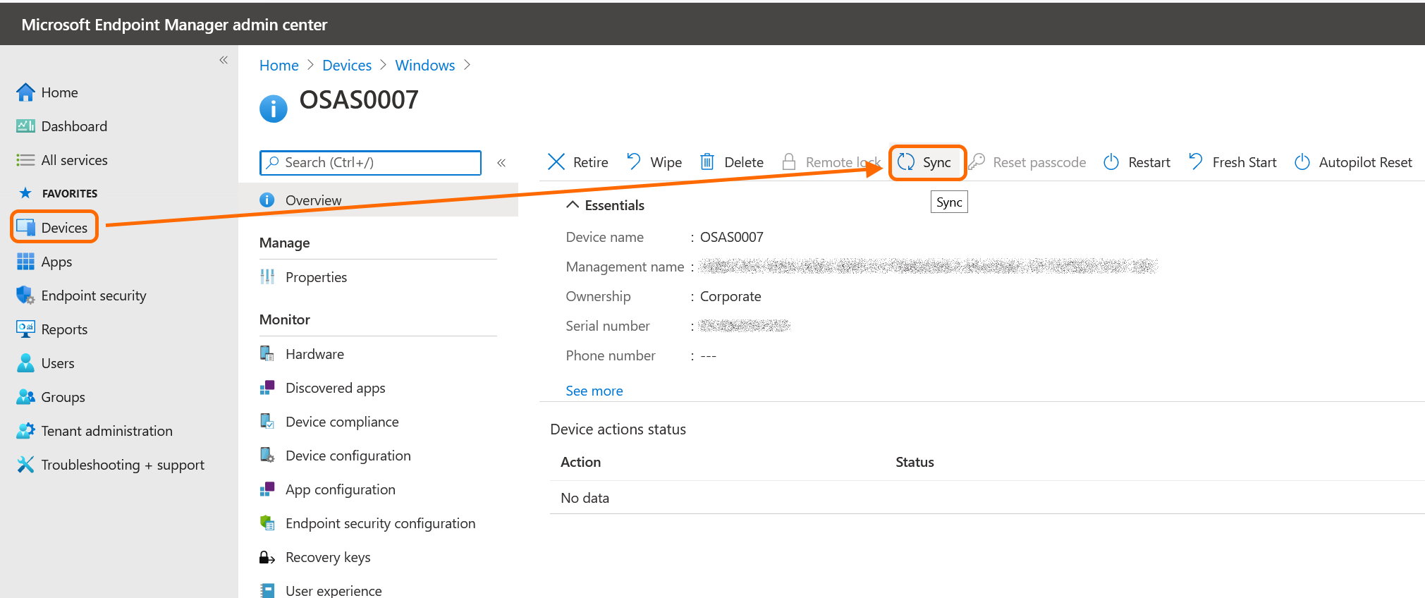 Als Administrator kann man eine Synchronisierung auch aus dem Microsoft Endpoint Manager Admin Center (Intune) auslösen, indem man unter „Devices“ den Computer auswählt und auf „Sync“ klickt.