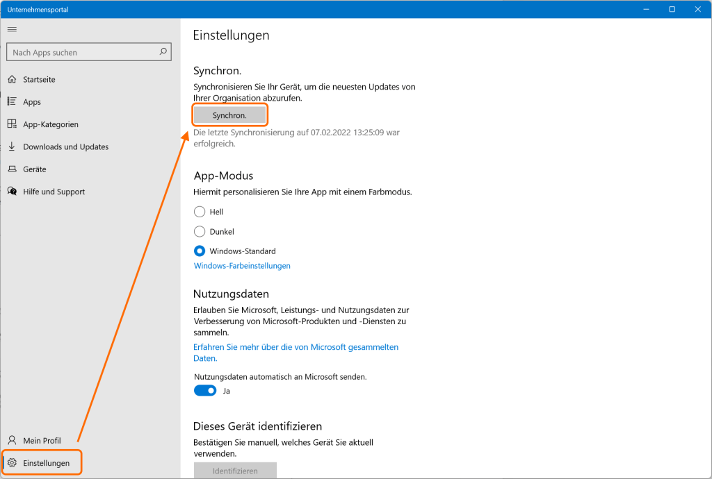 Ein Weg ist über das Programm „Unternehmensportal“. Wenn man dieses geöffnet hat, wählt man unten links „Einstellungen“ und dann „Synchron.“