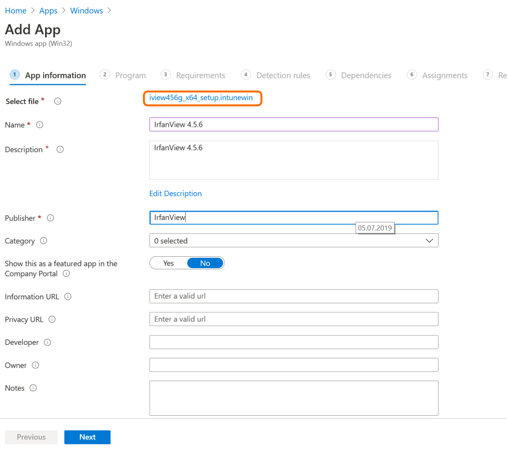 Auf der nächsten Seite lädt man die vorher erstellte .intunewin Datei hoch und füllt „Name“, „Description“ und „Publisher“ aus.