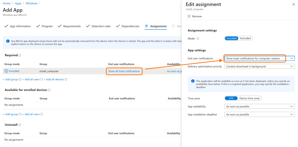 Bei „Assignments“ deaktiviere ich noch die „toast notifications“ (die Popup Meldungen rechts unten auf dem Bildschirm) und weise die App den gewünschten Computern zu.