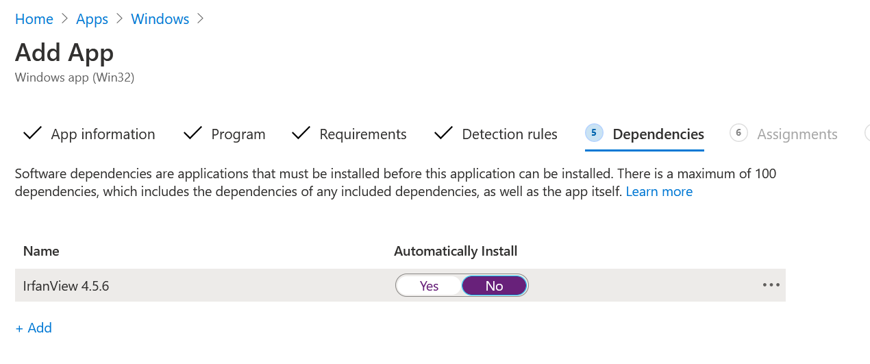 Damit zuerst das Programm und erst dann die Plugins installiert werden, trage ich bei „Dependencies“ das Programm ein. Da ich das Programm schon zugewiesen habe, wechsle ich „Automatically Install“ auf „No“.