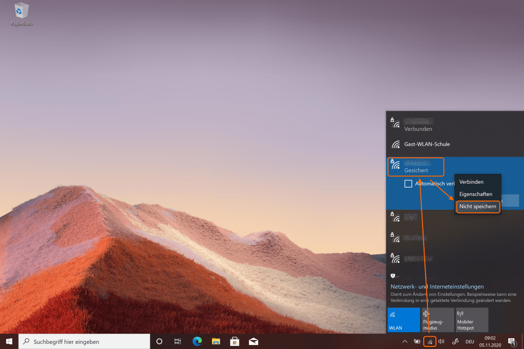 Variante 1: Man klickt auf das WLAN Symbol unten rechts in der Taskleiste, wählt das entsprechende WLAN aus, macht einen Rechtsklick darauf und wählt „Nicht speichern“