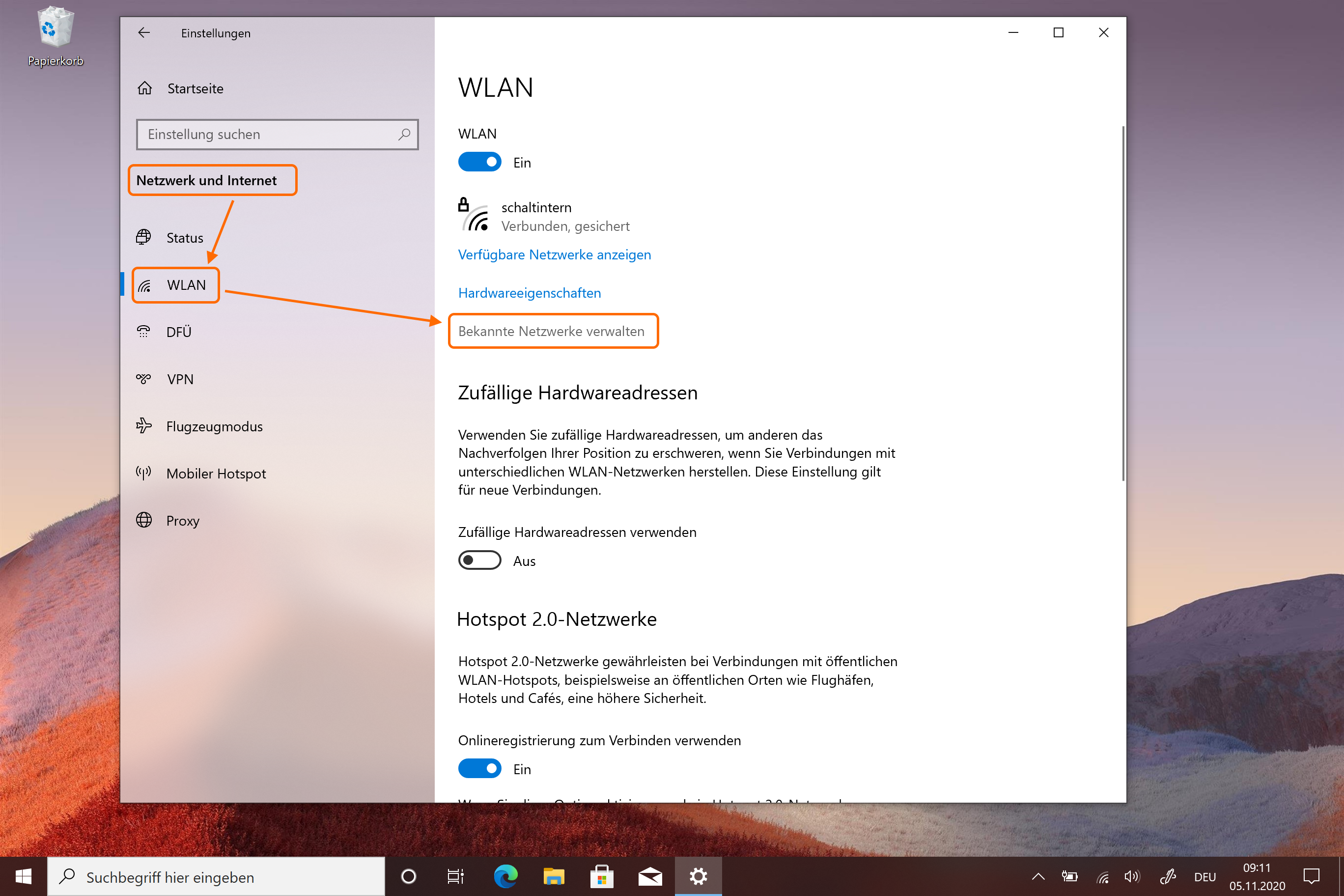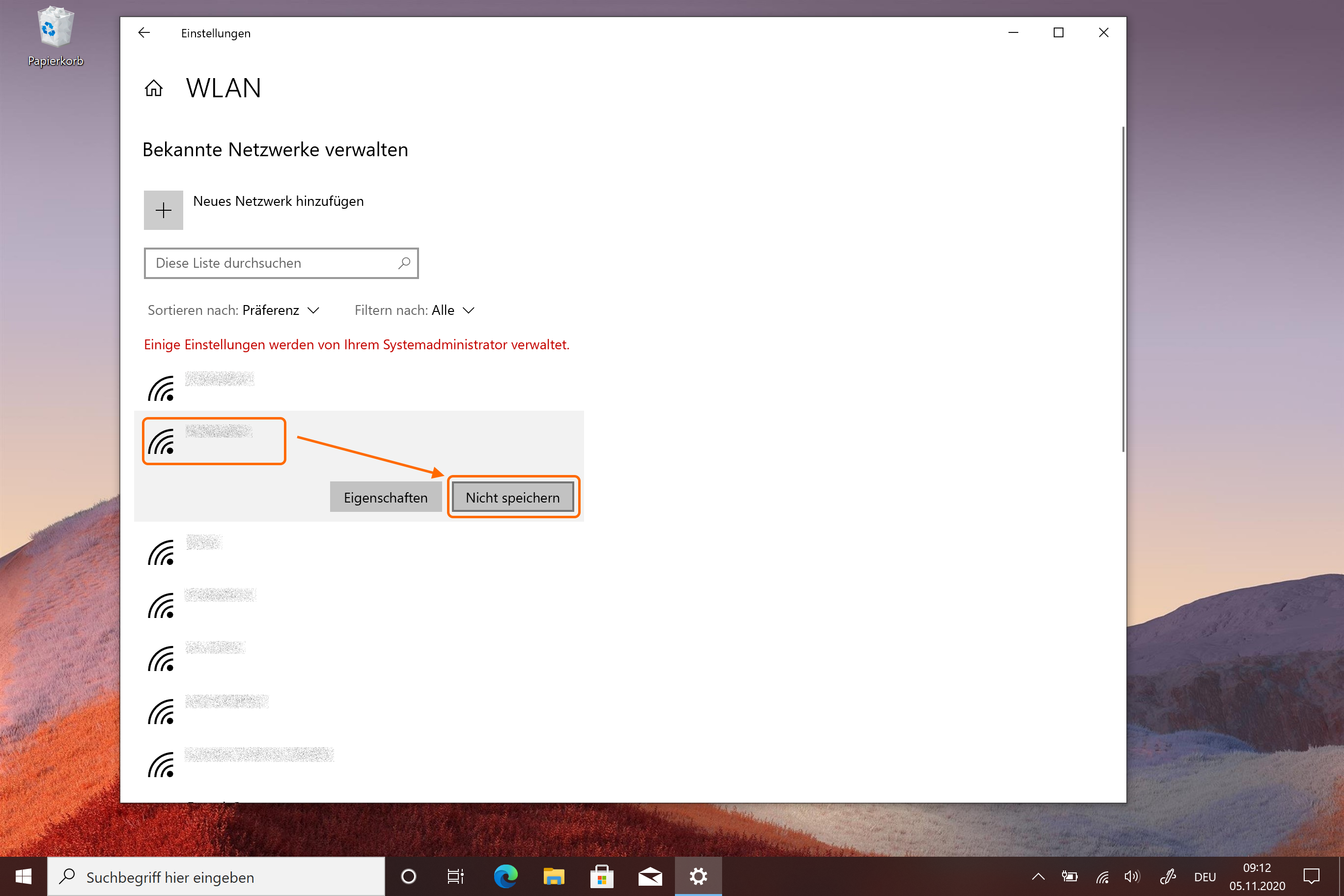 Variante 2: Man wählt „Start“ -> „Einstellungen“ -> „Netzwerk und Internet“ -> „WLAN“ und dann „Bekannte Netzwerke verwalten“. Hier kann man nun auch das gewünschte WLAN auswählen und auf „Nicht speichern“ klicken.