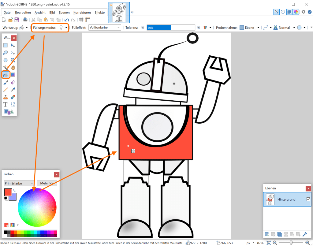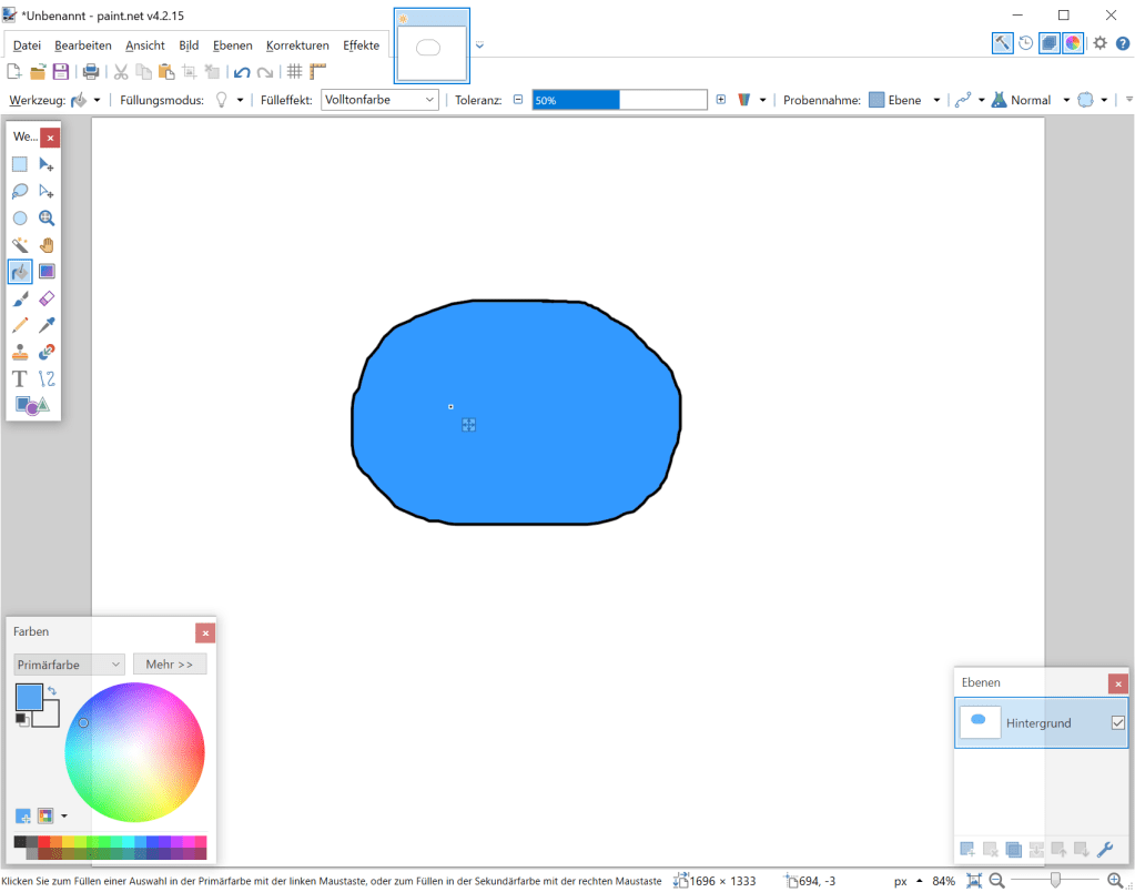 Eine zusammenhängende Fläche kann man einfach ausmalen, indem man das Farbeimer Werkzeug auswählt, zur Sicherheit noch den Füllungsmodus überprüft, eine Farbe auswählt und dann in den zusammenhängenden Bereich klickt.