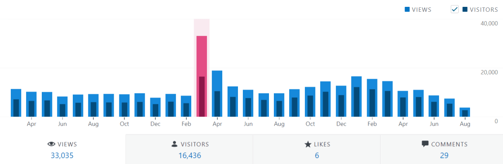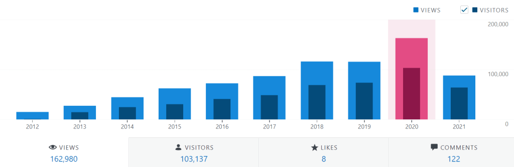 Über all die Jahre habe ich 662 Beiträge veröffentlicht und es wurde total 791’958 mal eine Seite des Blogs aufgerufen. Der 17. März 2020 war der Tag mit den meisten Views. An dem Tag wurden 1’928 Seiten meines Blogs angesehen.
