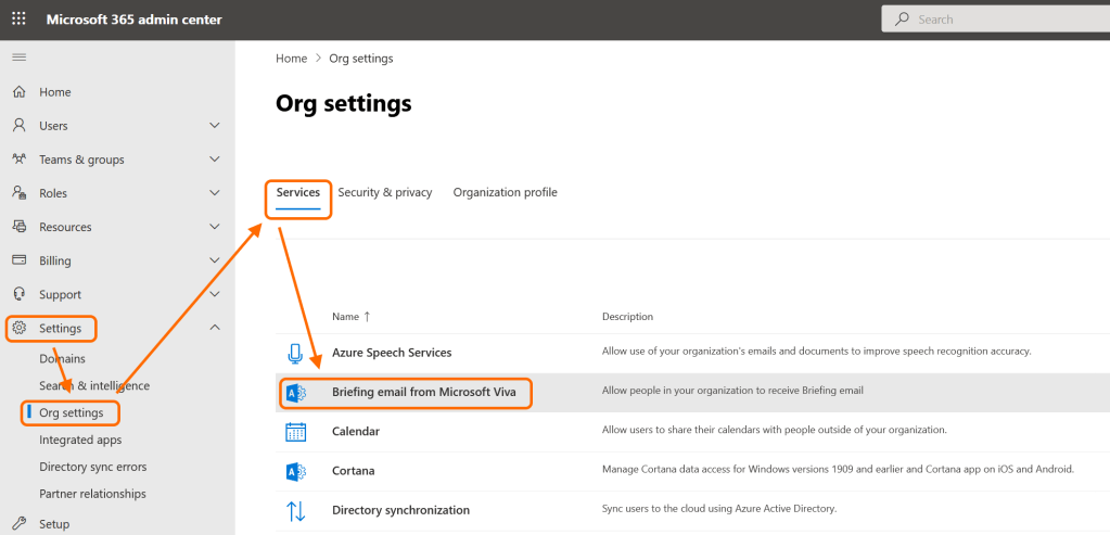 Es gibt aber auch die Möglichkeit, diese Mails für alle Benutzerinnen und Benutzer zu deaktivieren. Dazu meldet man sich am „Microsoft 365 Admin center“ an und wählt unter „Settings“ -> „Org Settings“ -> „Services“ -> „Briefing email from Microsoft Viva“.