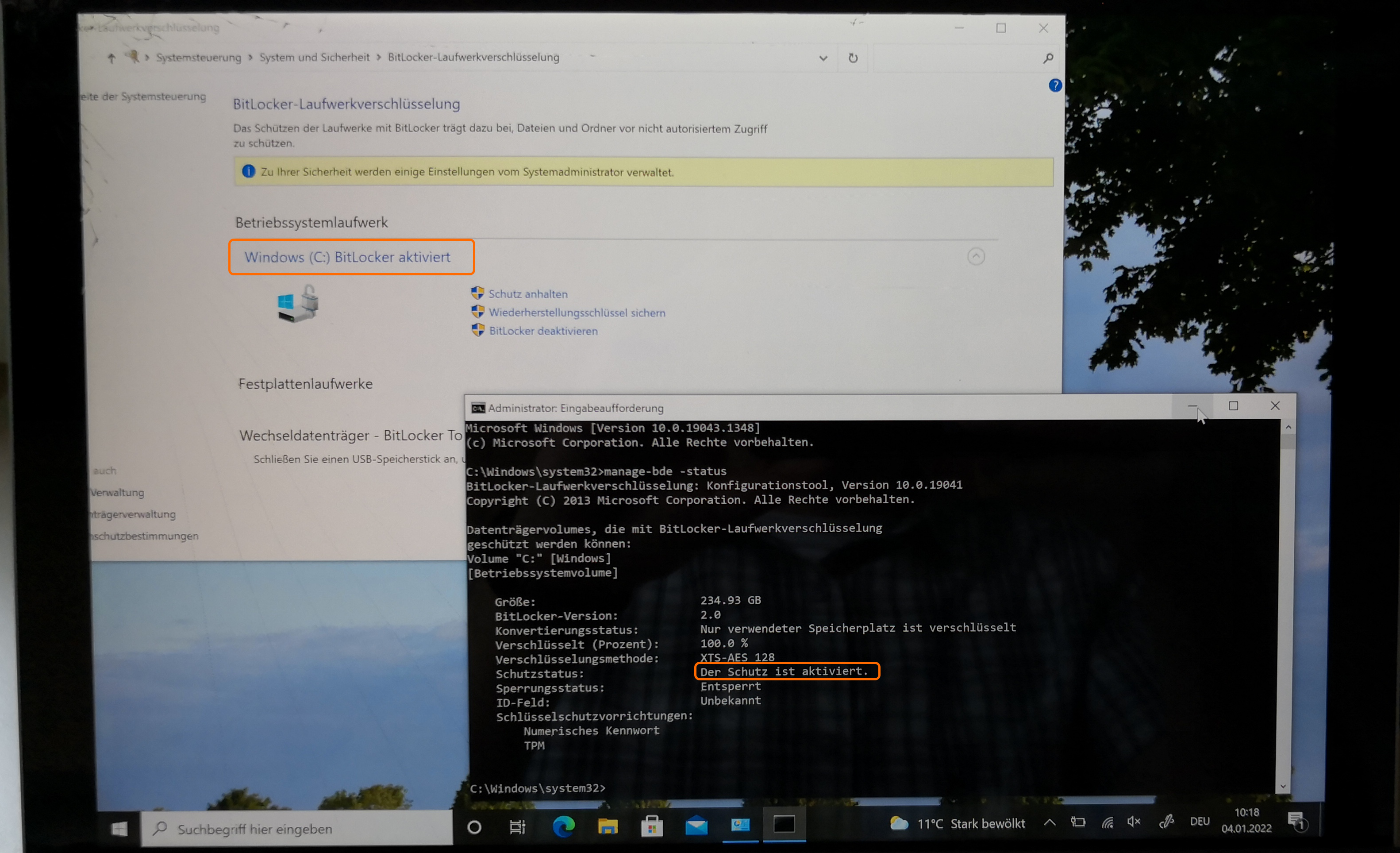 First I checked if the hard disk was really encrypted. In the screenshot you can see that the encryption of C: is enabled.