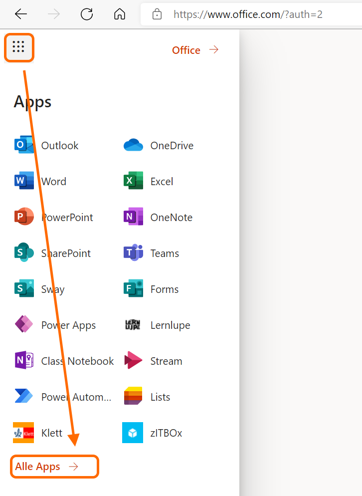Ein zweiter Weg ist es, das Office 365 Portal zu öffnen und dort die 9 Punkte oben links zu wählen. Danach kann man „Alle Apps“ auswählen und dort dann die App zITBOx oder die App Aprendo. Wenn man das einmal gemacht hat, sollte die App schon wie im Bild unten bei den zuletzt verwendeten Apps angezeigt werden.