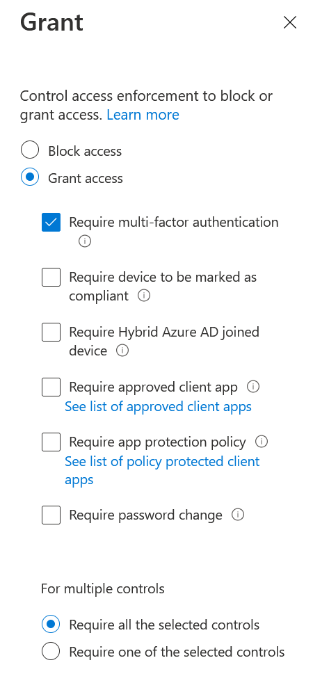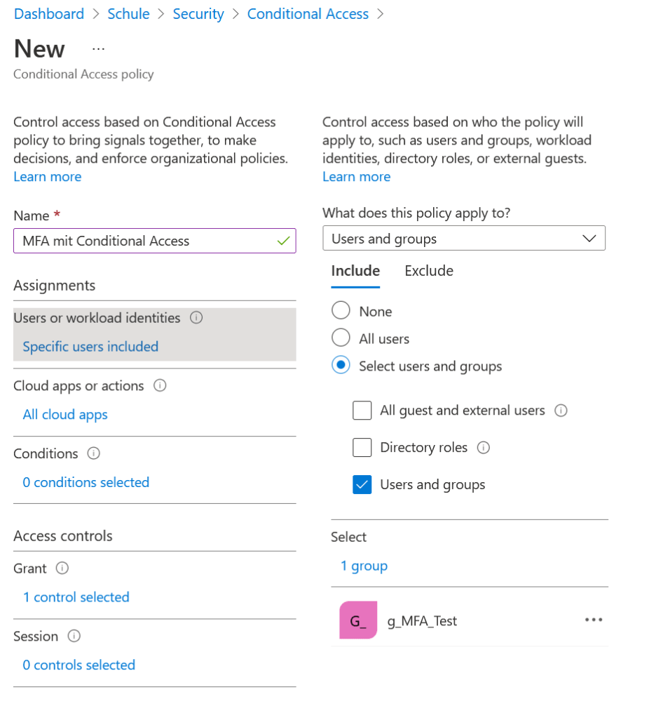 Bei „Cloud apps or actions“ wählt man „All cloud apps“ und bei „Access controls“ „Grant access“ mit einem Häklein bei „Require multi-factor authentication“.