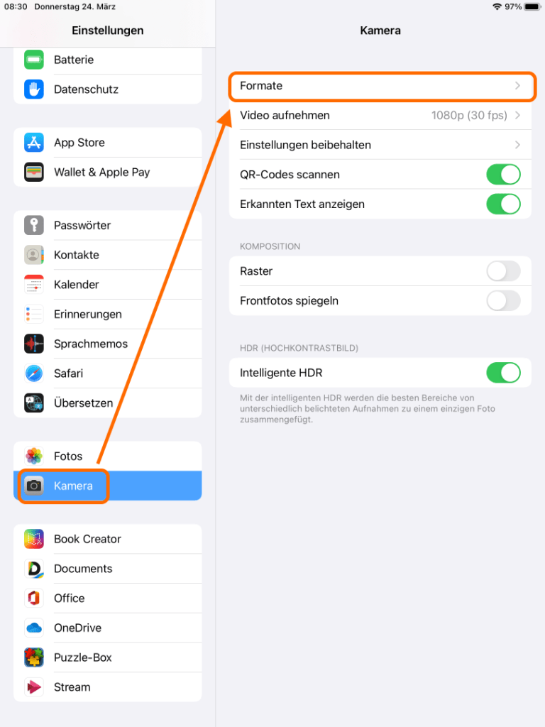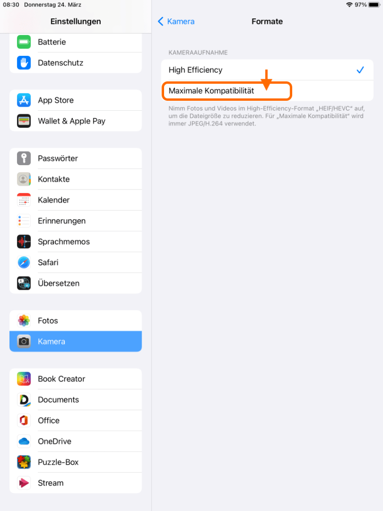 Wenn man mit dem iPad Fotos machen möchte, die man in anderen Programmen weiterverarbeiten möchte, sollte man das Standardformat ändern. Standardmässig werden Fotos im HEIC Format gespeichert. Man kann den Standard aber sehr leicht auf JPG ändern.