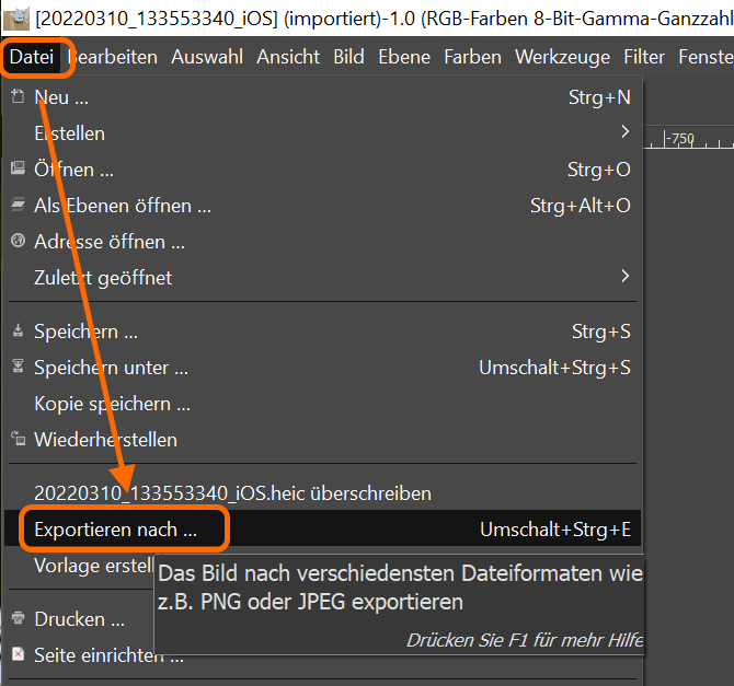 Bilder, die schon im HEIC Format gespeichert sind, können problemlos mit der Bildbearbeitung Gimp, die auf allen unseren Computern installiert ist, in JPG Dateien umgewandelt werden. Nachdem man das Bild geöffnet hat, über „Datei“ -> „Exportieren nach…“ das Bild mit einem neuen Namen speichern, z.B. als kompatiblesBild.jpg.